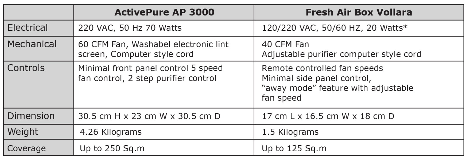Our Specifications For Portable (AP3000 & Vollara)